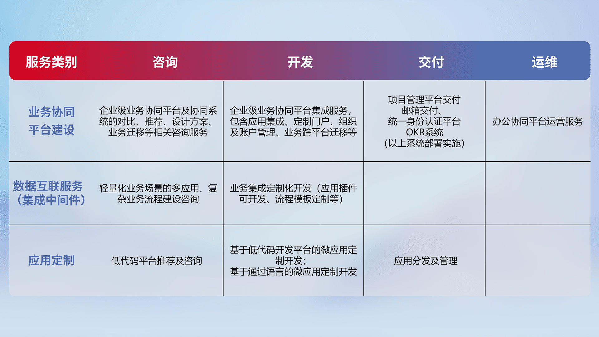 针对钉钉、、、企微、、、IDaas等平台级产品提供产品的规划、、、方案、、交付、、、定制化开发等服务,,实现如统一协同办公、、、、智能客户服务、、、、混合会议管理、、、智能数据查询、、、、等业务场景,,实现数字化转型。。